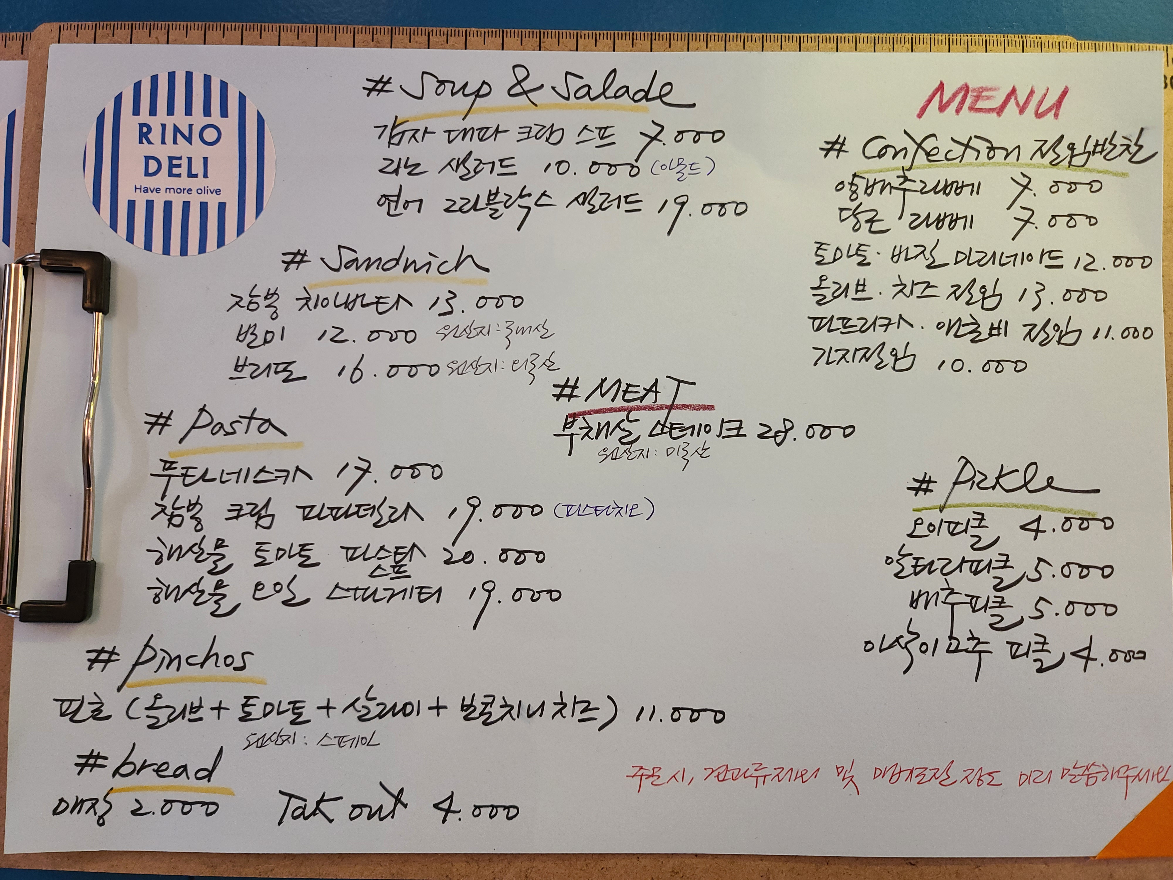 리노델리의 메뉴. 우리는 앞으로 자주 올 계획이라 모든 메뉴를 먹게 되지 않을까 싶다.