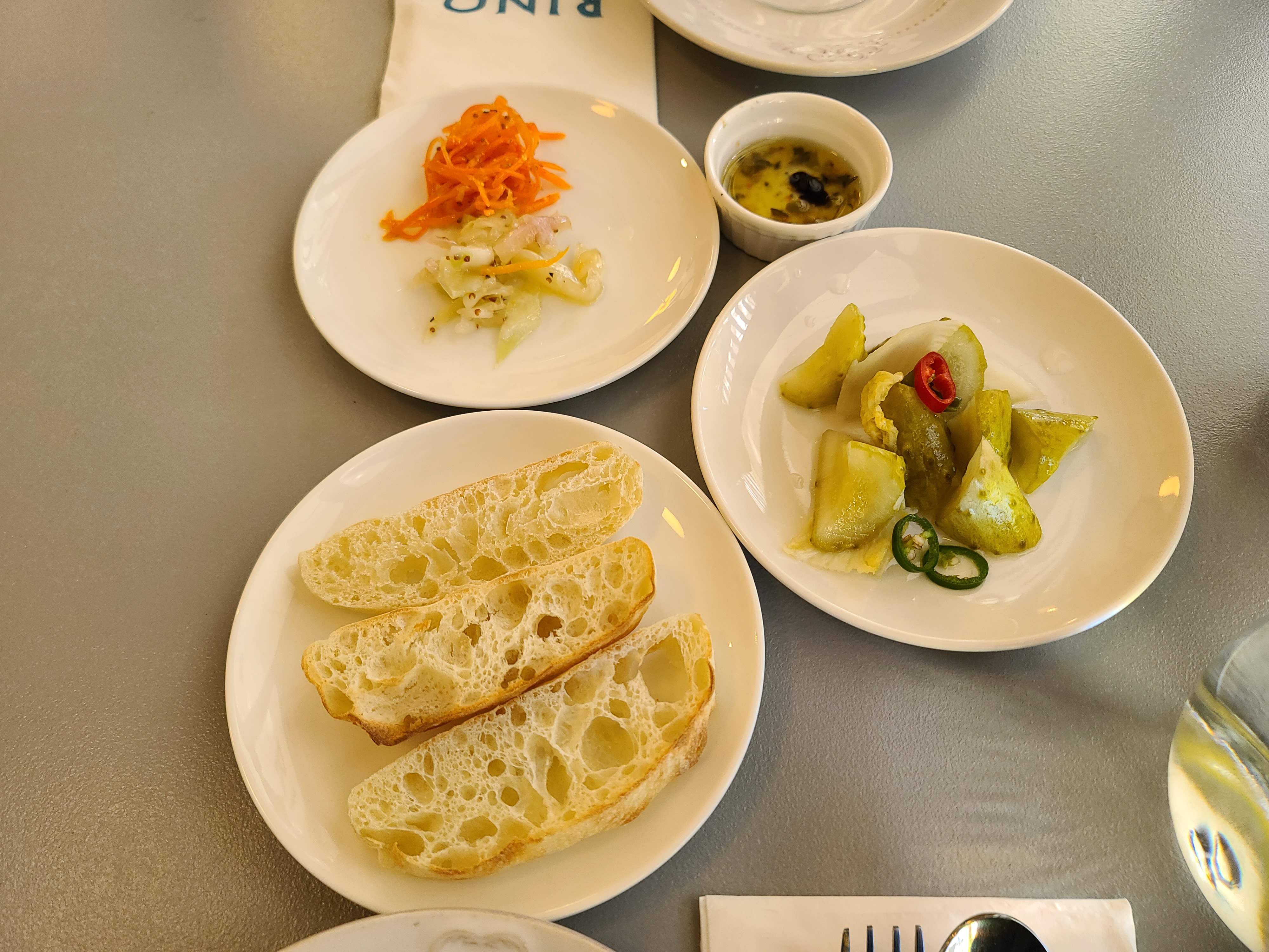치아바타 빵과 피클류, 당근, 양배추 라뻬, 그리고 조미가 살짝 된 올리브유도 나온다. 모두 이곳에서 직접 만든 것들이고, 정말 맛있다. 아주 맛깔나고 흔치 않은 맛이다.